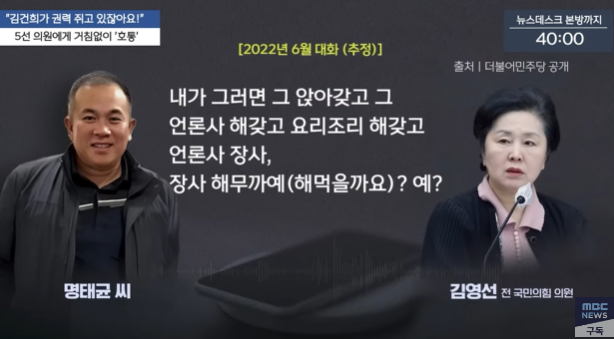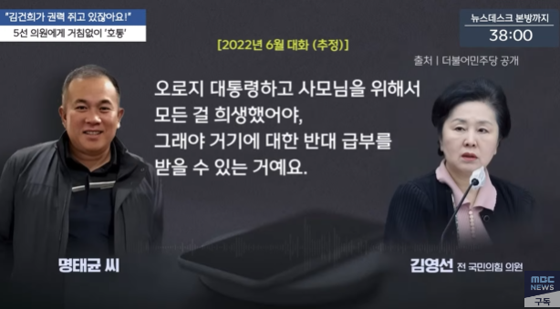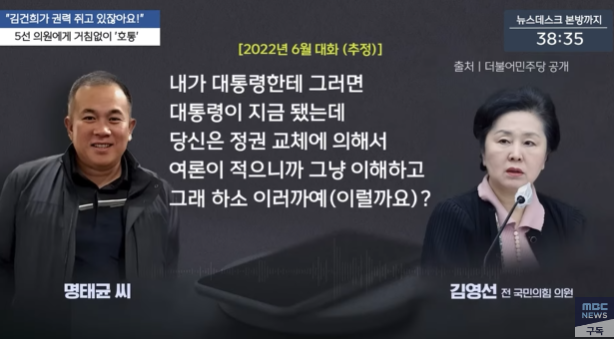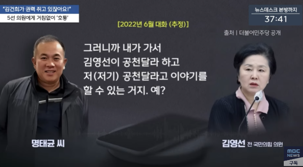 명씨는 아울러 “내가 대통령한테 대통령이 됐는데 당신은 정권 교체에 의해서 여론이 적으니까 그냥 이해하고 그래 하고 이러까예”라며 “청와대(용산)에서 지역 조사하는 거 에이알에스(ARS·자동응답방식) 돌리는 거 그거 받아야지예. 내가 이문을 남거나, 돈을 벌거나, 어떤 행위를 하게 되면 대표님하고는 아무도 공천 못 받아요”라고 말하기도 했다.