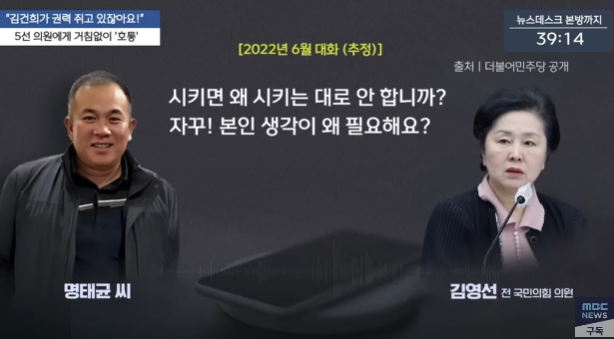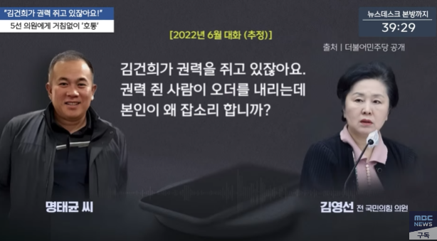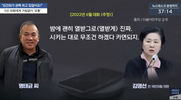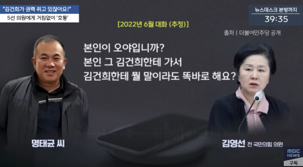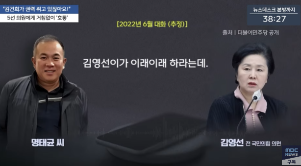 앞서 더불어민주당이 2024년 10월31일 공개한 명씨와 김 전 의원의 2022년 6월께 통화 녹음 파일을 들어보면, 명씨는 “대통령이 알아서 하겠다고 하는데 왜 그래요? 내가 지시받았댔잖아. 오더 내려왔다 했잖아. 김건희가 권력을 쥐고 있잖아요. 권력 쥔 사람이 오더(지시)를 내리는데 본인이 왜 잡소리 합니까?”라며 김 전 의원을 윽박질렀다.