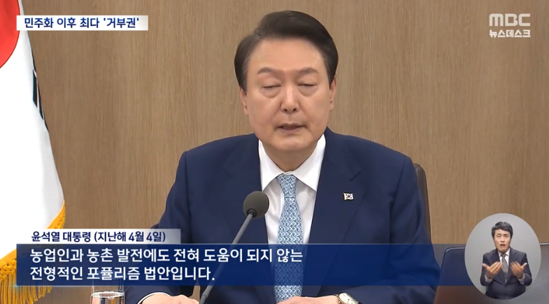 윤석열 대통령의 거부권은 취임 1년이 채 되지 않아 나왔습니다.
