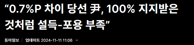 동아일보가 윤석열이 0.7% 차이로 당선되었는데도, 다른 정당들, 그리고 국힘 자기 당내 다른 정치인들을 포용하지 못한다고 지적했다. 맞는 이야기이다.