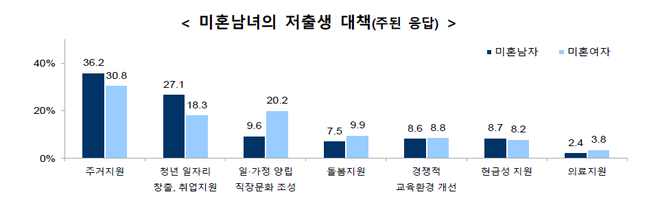 ◦ 미혼남녀 모두 주거지원이 가장 높고, 다음으로 미혼남자는 청년 일자리 창출,