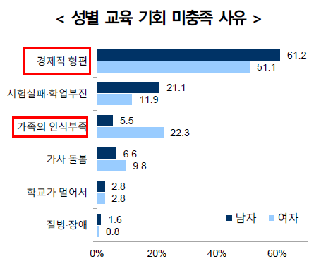 교육 기회를 갖지 못한 이유들. 경제형편, 시험실패, 가족의 인식 부족.