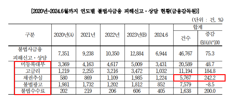 연도별로는 △2020년 7,351건, △2021년 9,238건, △2022년 1만 350건, △2023년 1만 2,884건, △2024년 1~6월 6,944건이며, 2023년의 경우 2020년 대비 무려 75.4%나 급증한 것으로 확인됐다. 유형별로는 미등록대부와 고금리로 인한 신고·상담건수가 전체 68.0%에 달했다.