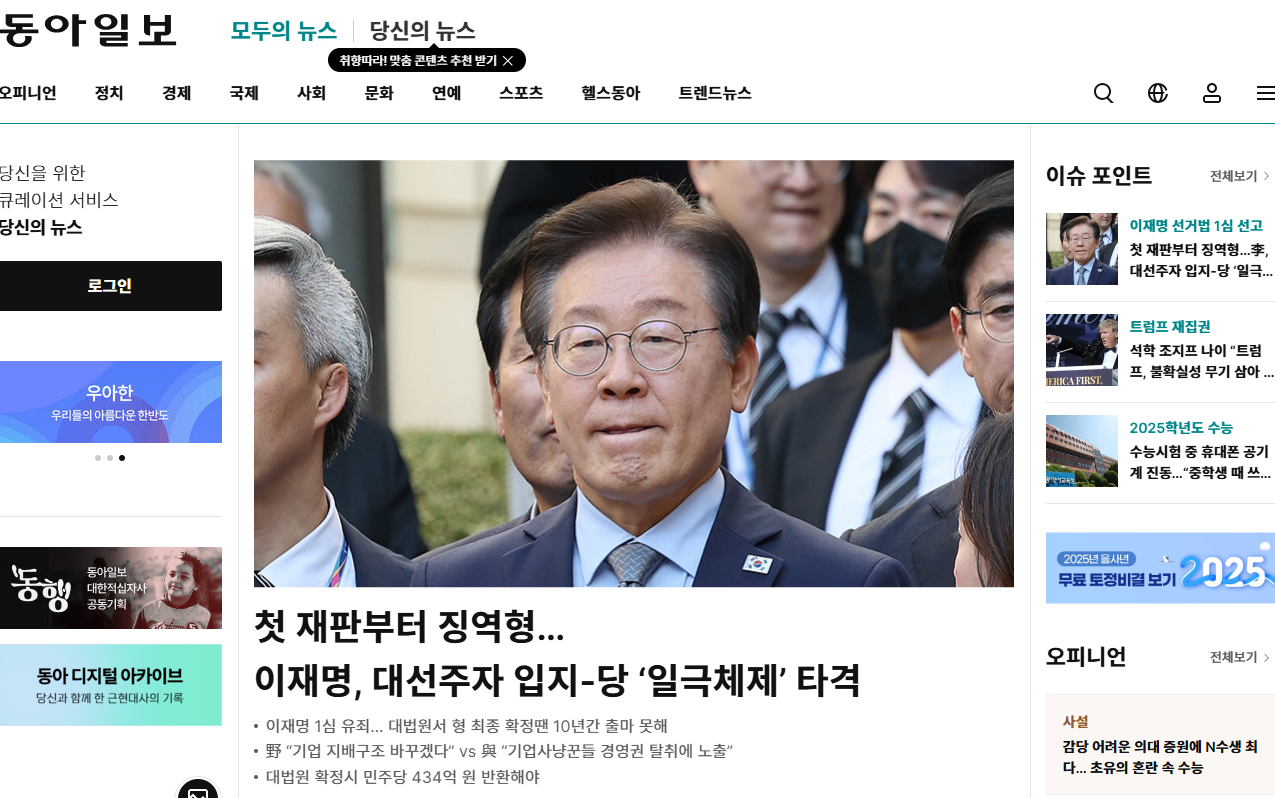1) 동아일보 - 첫 재판부터 징역형, 이재명 대선 주자 입지, 당 '일극체제' 타격 제목.