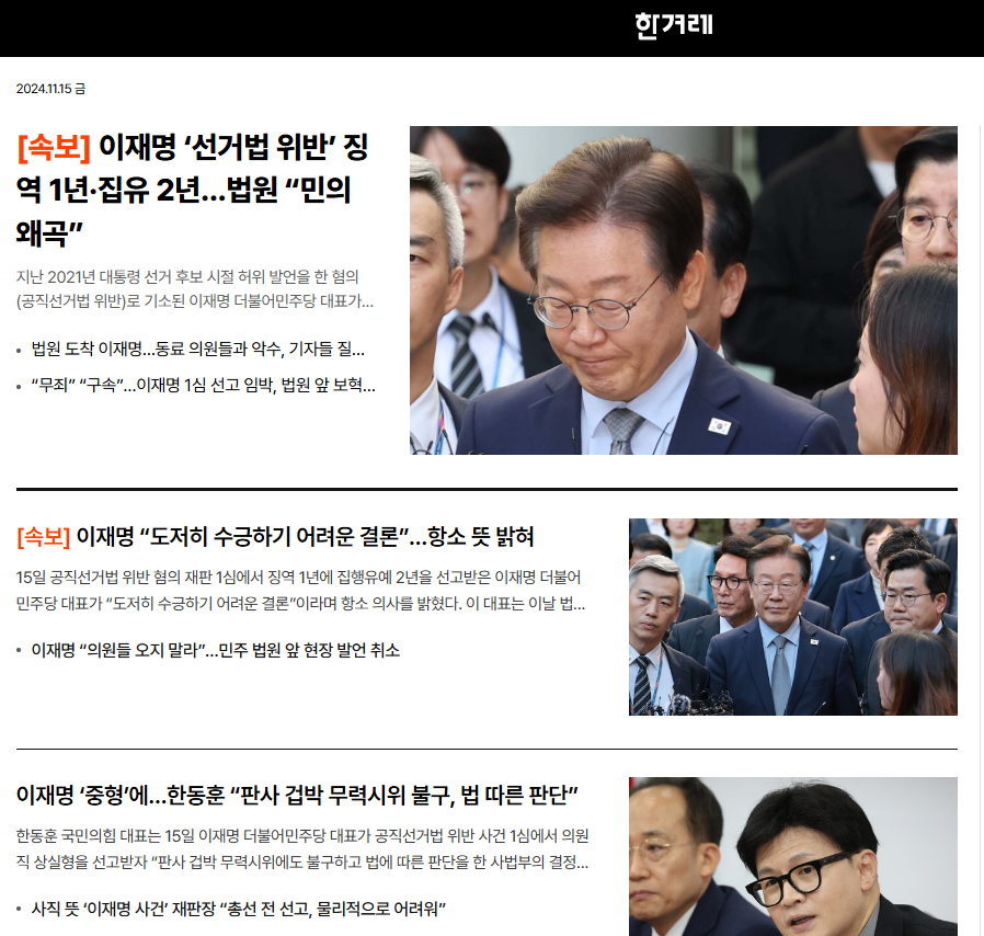 2)한겨레 - 이재명 '선거법 위반' 징역 1년, 집유 2년, 법원 "민의왜곡" 판단. 재판부 판결 내용을 제목으로 뽑음.