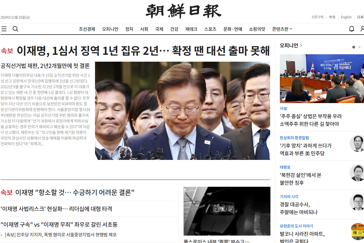 조선일보. 이재명, 1심서 징역 1년, 집유 2년, 확정땐 대선 출마 못해. 제목으로, 이재명이 항소할 경우, 대법원에서도 1심과 동일한 형량을 판결할 경우, 2027년 대선 후보로 출마할 수 없다는 사실을 밝힘.