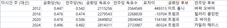 2024년 미국 대선 분석. 경합주 중에 하나인, 미시건 주 경우.