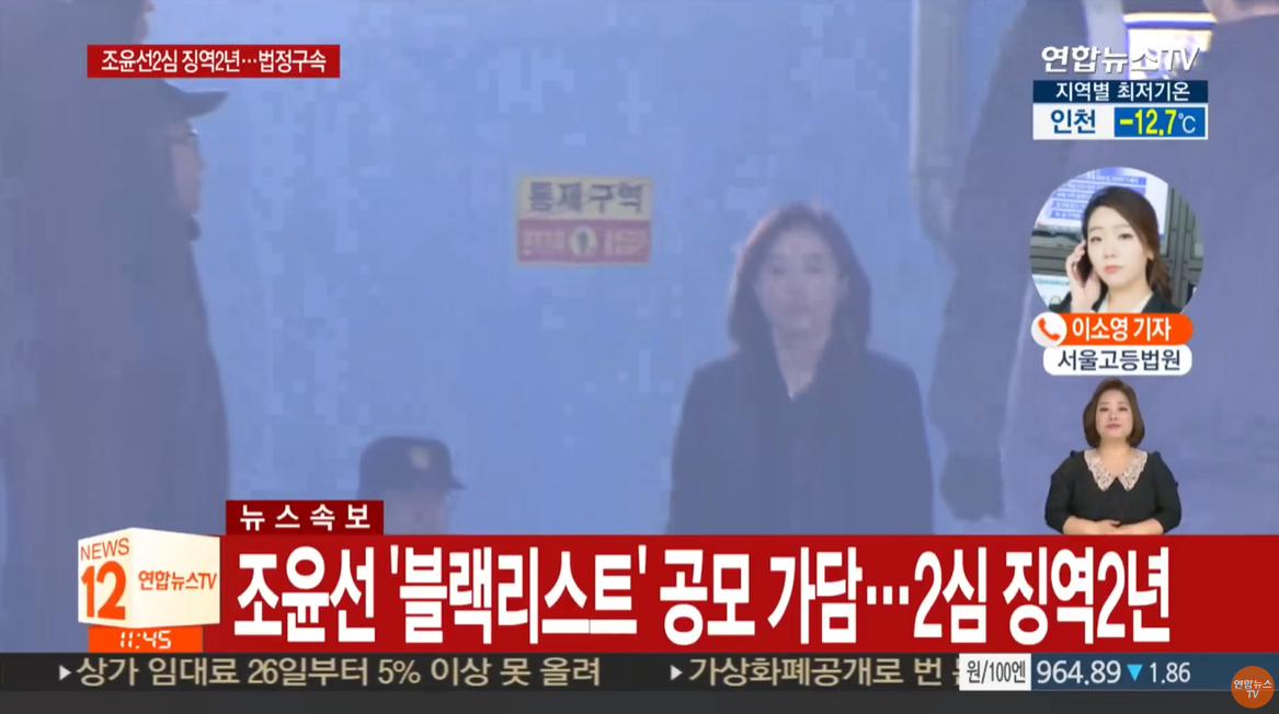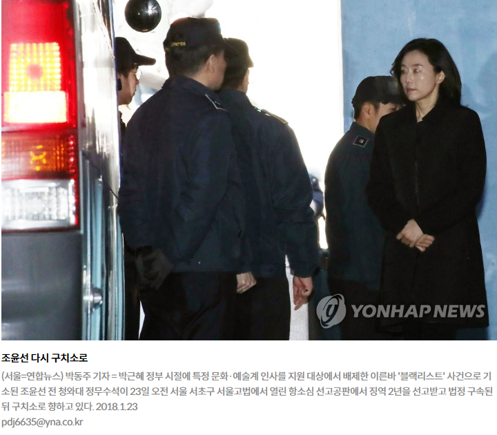 블랙리스트 사건에서 1심 재판에서 집행유예로 풀려났던 조윤선 전 장관이 징역 2년을 받아 다시 구속됐습니다.