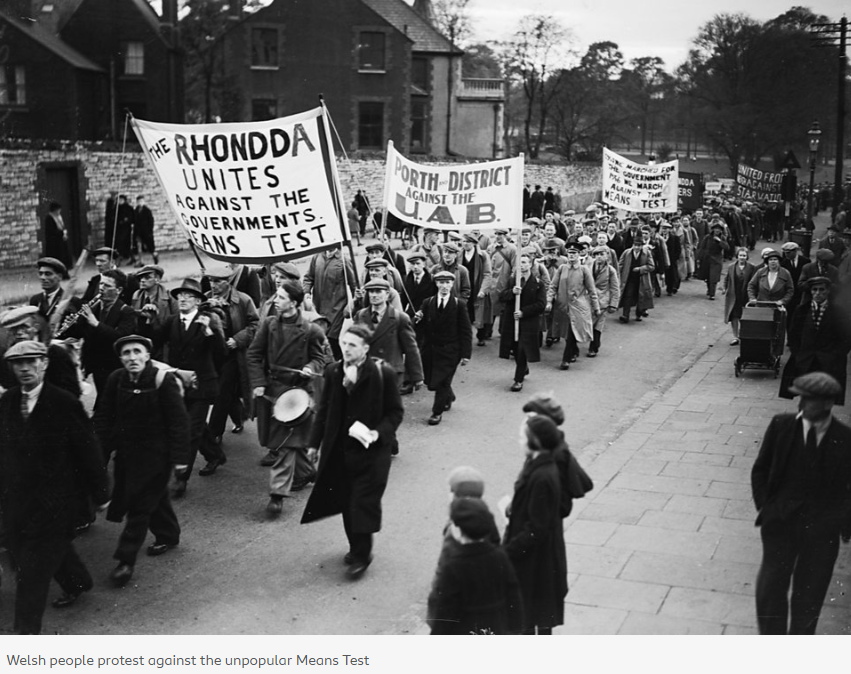 웨일즈 사람들이 '자산과 소득 조사 Means-Test'에 반대하는 시위를 벌이고 있다.