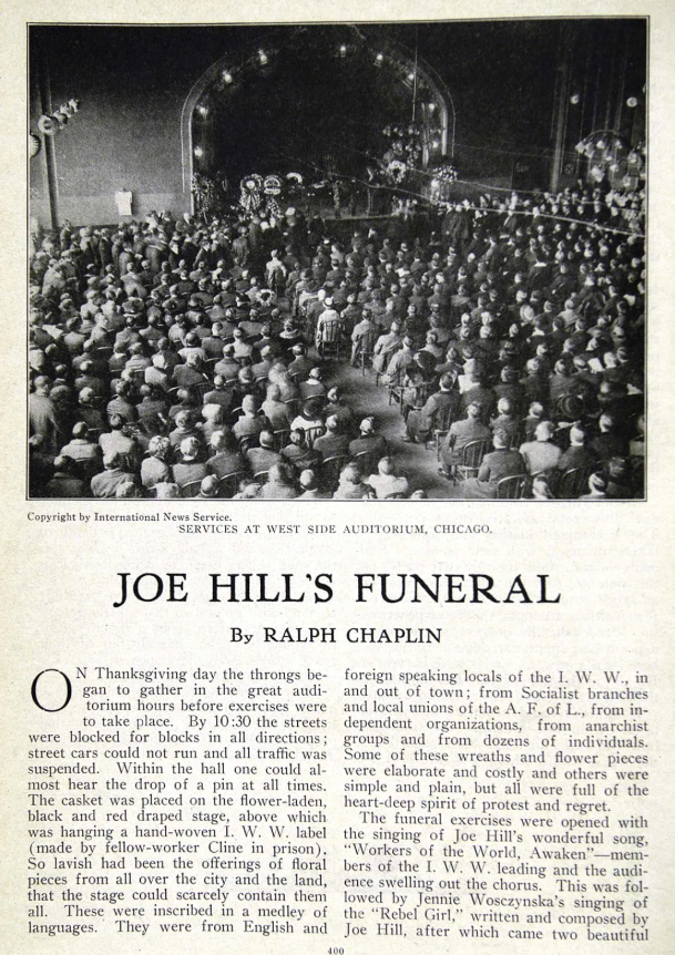 First page of “Joe Hill's Funeral,” an article published in International Socialist Review, January 1916.