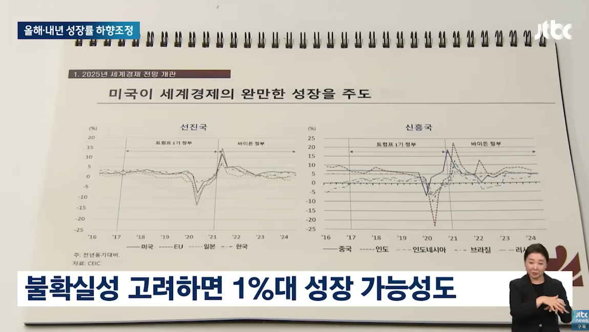 트럼프 당선 후폭풍과 중국 등 주요 무역국의 성장 둔화, 지정학적 위험 등 불확실성까지 고려하면 사실상 1%대 성장 가능성도 열어놨습니다.