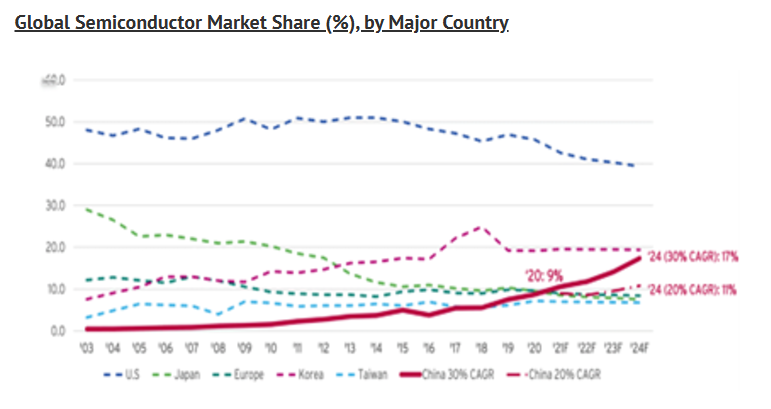 최근까지도 미국은 초강대국으로서 그 선두자리를 유지하기 위해 최고속 칩을 디자인하고 생산해왔다. 그러나 21세기 들어, 미국은 타이완, 한국, 유럽, 무엇보다도 중국과 같은 경쟁국가들의 도전으로 인해, 그 우위를 점점 더 상실하고 있다.