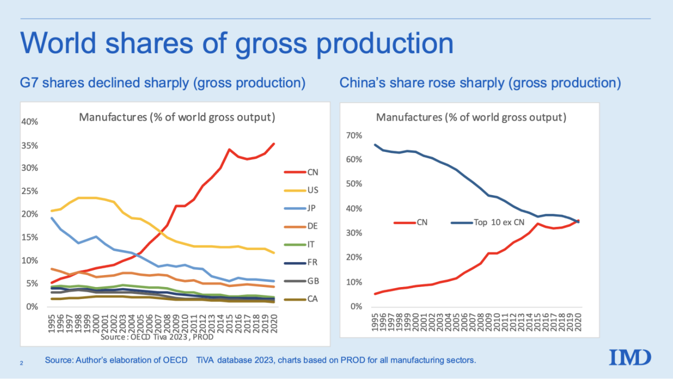 중국의 제조업은 세계 생산과 무역에서 이제 지배적인 세력이 되었다. 중국 제조업 생산량은 2위부터 10위까지 국가들의 제조업 생산량을 합친 것보다 더 많다. 동시에 중국이 디지털 기술에서 선두를 달리는 미국을 빠른 속도로 뒤쫓고 있다.