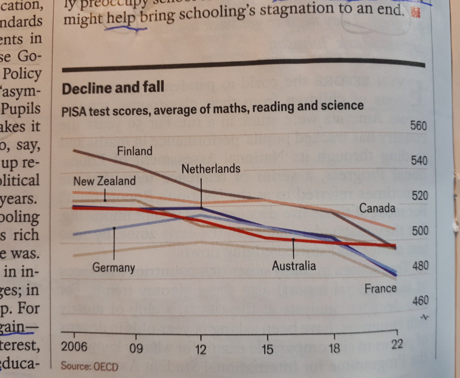 프랑스, 독일, 네덜란드, 뉴질랜드 학생들은 하락세. 특히 핀란드 한 때 우등생이었는데 평범해졌다.