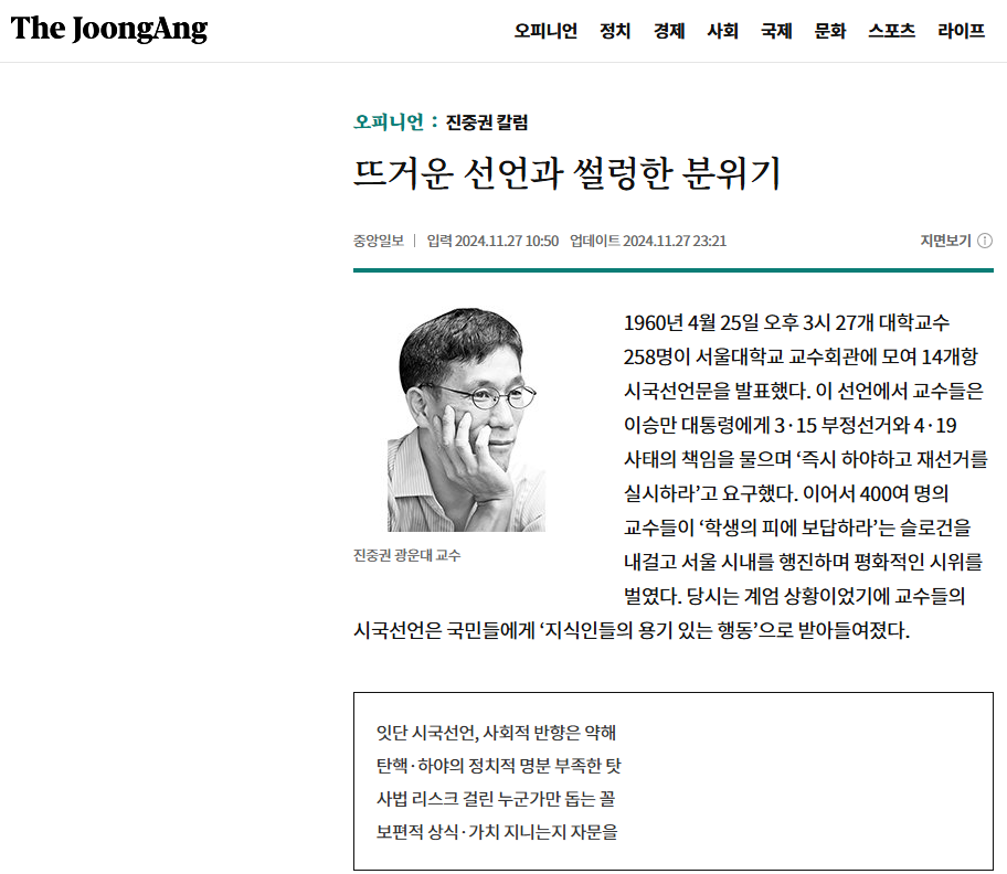 진중권과 김경율이 윤석열 정치코치를 하다가, 한동훈의 브레인 역할을 하고 있다. 지난 주 중앙일보에서 진중권은 '윤석열 자진 하야'와 '퇴진'을 주장하는 대학가 교수들의 시국선언이 아주 썰렁하다고 비난했다.