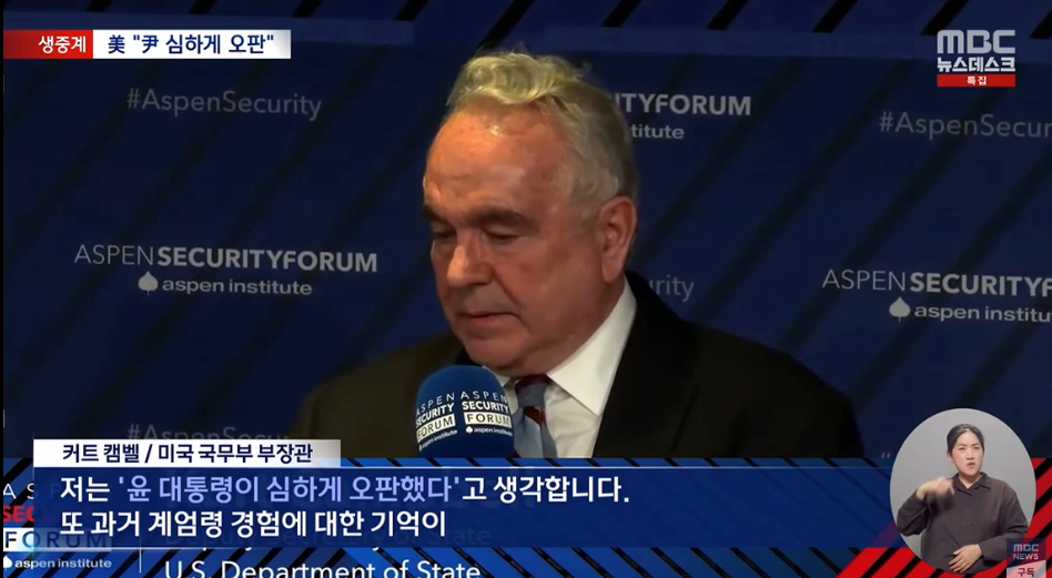 커트 캠벨, 윤석열의 심각한 판단착오다. 과거에 ‘계엄령’을 겪어 본 한국사람들에게는 그것에 대한 굉장히 심각하고 부정적인 반향이 아직도 남아있다.