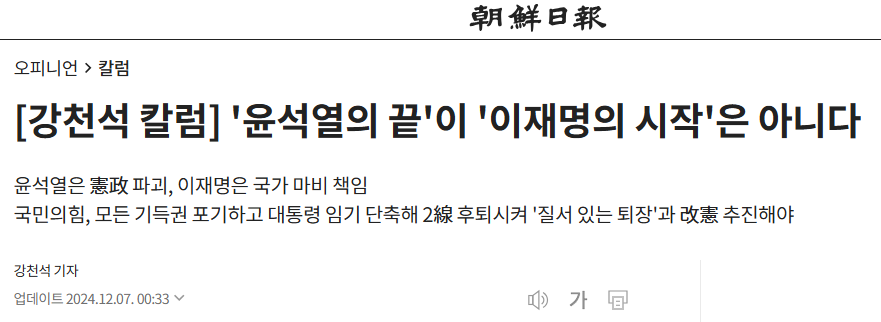[강천석 칼럼] '윤석열의 끝'이 '이재명의 시작'은 아니다 윤석열은 憲政 파괴, 이재명은 국가 마비 책임 국민의힘, 모든 기득권 포기하고 대통령 임기 단축해 2線 후퇴시켜 '질서 있는 퇴장'과 改憲 추진해야 강천석 기자 입력 2024.12.07.- 국가 지도자로서 윤석열 대통령은 끝났다. 대통령이란 직명(職名)이 얼마나 더 오래 붙어 있을지 모르지만 국가 지도자 자격은 잃었다.