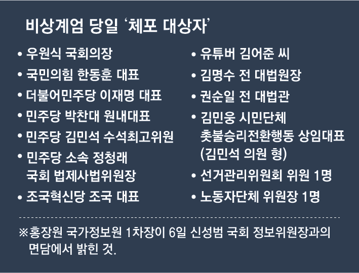 홍 차장이 육사 후배이자 윤 대통령 고교(충암고) 동문인 여인형 방첩사령관으로부터 체포 명단을 전달받은 건 13분 뒤인 오후 11시 6분이었다. 윤 대통령이 체포를 명령한 ‘리스트’에는 국회의장과 여야 대표뿐만 아니라 민간인도 포함됐다.