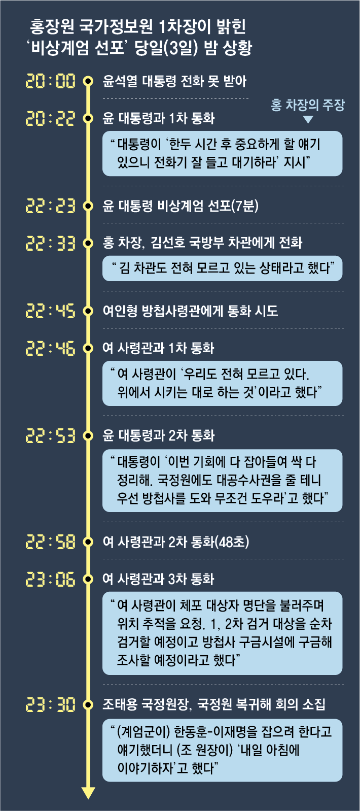 홍 차장은 계엄 선포 이후인 오후 11시 30분, 국무회의가 끝나고 돌아온 조 원장이 주재한 내부 회의에서 “한동훈, 이재명을 잡으려 한다”는 취지의 보고를 했지만 조 원장은 “낼 아침에 이야기하자”고 말했다고 주장했다. 관련 사정에 정통한 소식통은 “홍 차장은 대통령 지시를 6일까지도 조 원장에게 얘기하지 않았다”고 전했다.