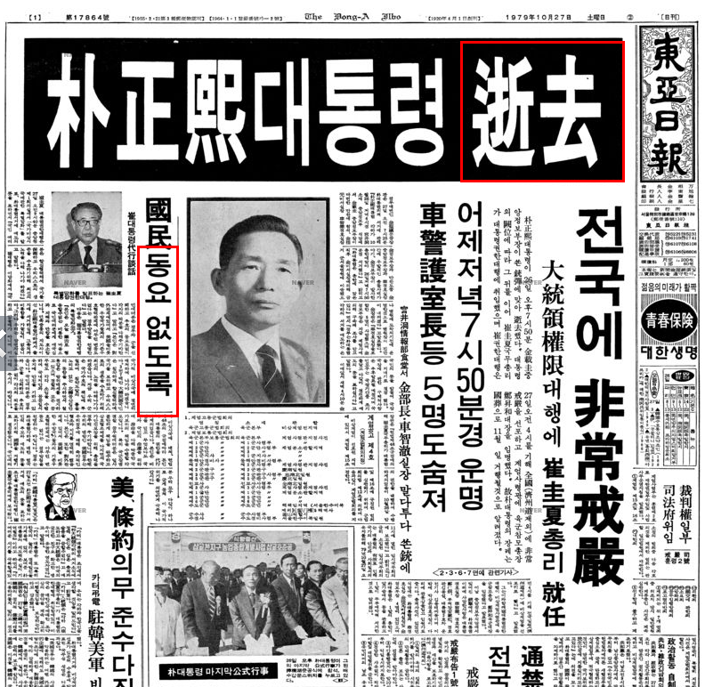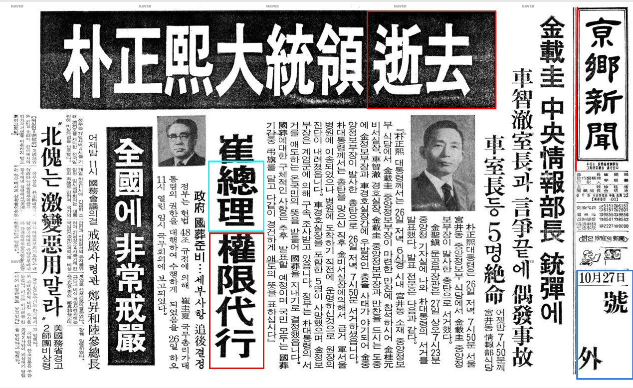 1979년 10월 26일 박정희 사망. (경향신문 호외)를 보라. 박정희의 '서거', 그리고 최규하 '총리'가 대통령 권한을 대행한다.