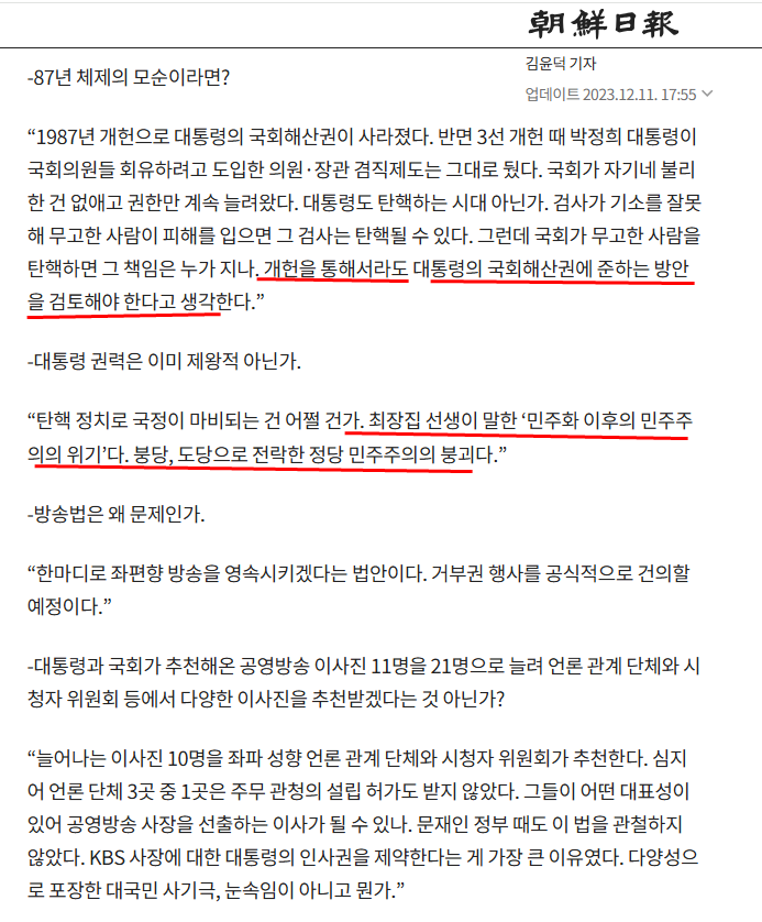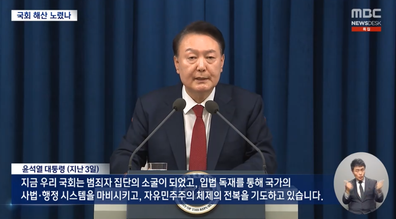나는 이동관이 작년 11월 에 '국회해산권'을 대통령에게 돌려주자고 주장했을 때, 그냥 시대착오적 미친 소리에 불과하다고 콧웃음을 쳤다. 그러나 이동관 발언 1년 후, 윤석열이 어설프지만 진짜 군대를 동원해 국회를 공격하고, 국회의원들을 체포하려고 시도를 했다.