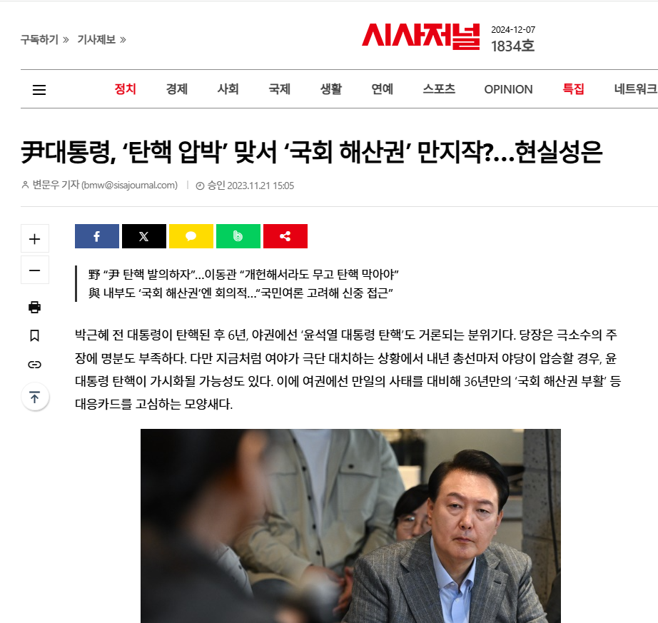 尹대통령, ‘탄핵 압박’ 맞서 ‘국회 해산권’ 만지작?…현실성은 - 시사저널
