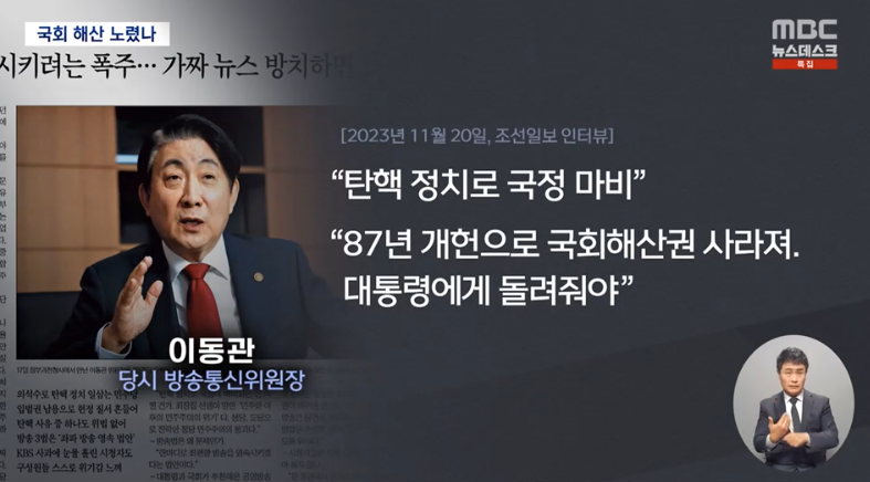 이동관 전 방송통신위원장도 지난해 11월, "탄핵 정치로 국정이 마비되고 있다"며 "87년 개헌으로 사라진 국회해산권을 대통령에게 돌려줘야한다"고 주장했습니다.