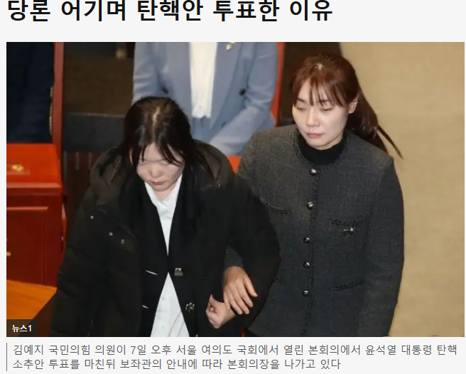 국민의힘 105명 국회의원이 윤석열 탄핵표결을 아예 거부했다. 장애인 김예지 의원은 국힘 '불참' 당론을 거부하고 투표에 참여했다. 그 이유는 윤석열 계엄령의 부당함 때문에 탄핵 찬성표를 던졌다고 한다. 김상욱 국힘의원도 표결도망을 하지 않고 참가해 동료의식도 들었다고 말했다. 당론을 거부하고 탄핵 찬성표 행사한 후, 수많은 비난 문자를 받았고, '사퇴해라' '국힘을 나가라'는 욕설을 들었다고 한다.