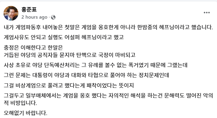내가 계엄파동후 내어놓은 첫말은 계엄을 옹호한게 아니라 한밤중의 헤프닝이라고 했습니다.