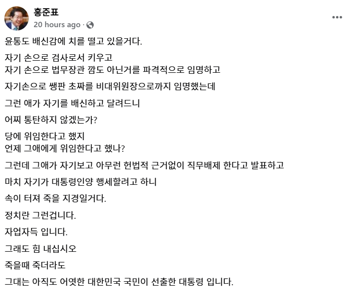 | 홍준표의 입장. 윤석열 탄핵반대. 한동훈 대표 사퇴 주장. (6) | 2024.12.08 |