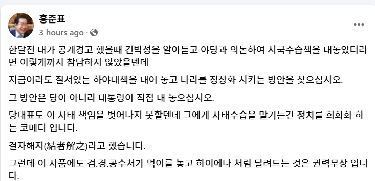 국민의힘 내부 무질서한 권력투쟁과 자중지란 현장. 홍준표의 일관된 주장은, 윤석열은 한동훈시키지 말고, 자신이 직접 나서서 '퇴진 계획'을 발표하라는 것이고, 두번째는 한동훈 대표에 대한 비난이다.
