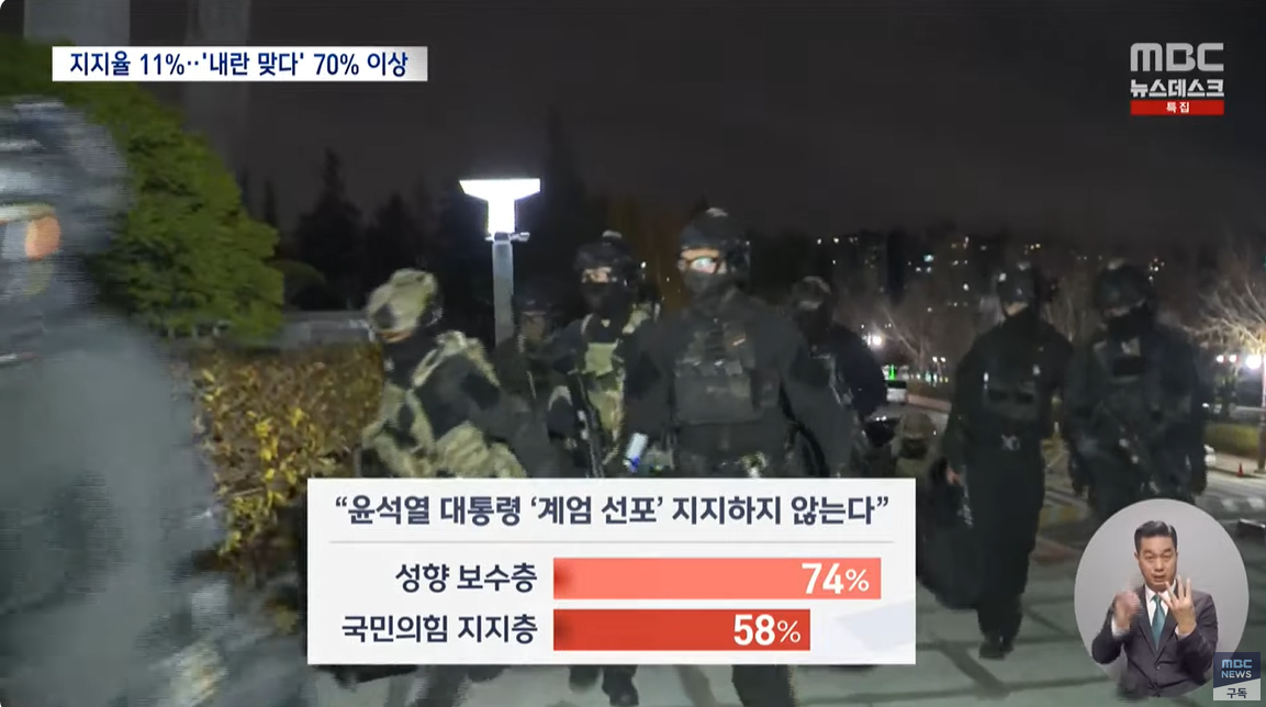 윤석열의 계엄 선포 지지하지 않는다. 보수층 74%, 국민의힘 지지층 58%