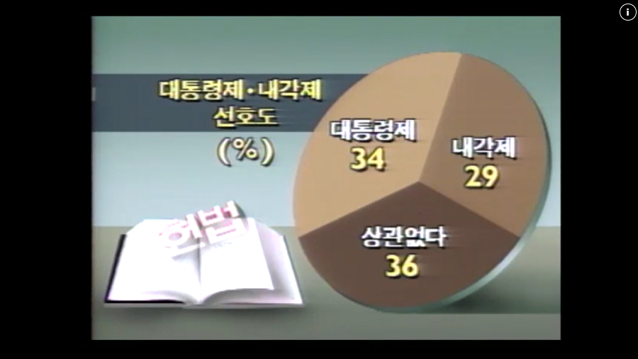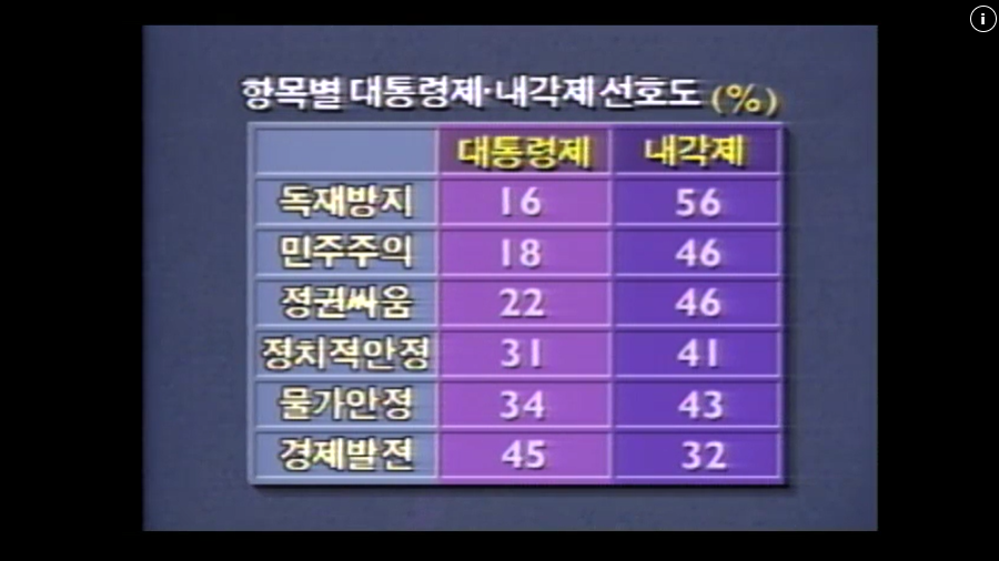 여론조사기관인 한국 리서치가 제헌절을 맞아서 서울의 만20살 이상 남녀 4백 명을 대상으로 실시한 여론조사결과 응답자들은 현재 대통령제나 내각제를 비교할 때 독재방지와 민주주의 그리고 정치적 안정을 위해서는 내각제가 더 바람직하다고 대답하고 대통령제는 경제발전을 이루는데만 더 좋다고 지적