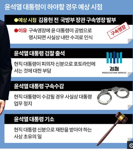 윤 대통령에 대한 검찰 출석 시점도 분기점으로 보고 있다. 헌정사상 최초로 현직 대통령이 검찰 포토라인에 서는 불명예를 피하기 위해 하야를 결단할 수 있다는 것이다. 검사 출신인 김웅 전 국민의힘 의원은 "대통령은 자기 잘못을 절대 인정하지 않는 스타일이지만 멘털은 의외로 약한 편"이라며 "윤 대통령의 성격을 고려하면, 현직 대통령 신분으로 조사받는 것은 스스로 받아들이지 못할 수 있다"고 말했다.