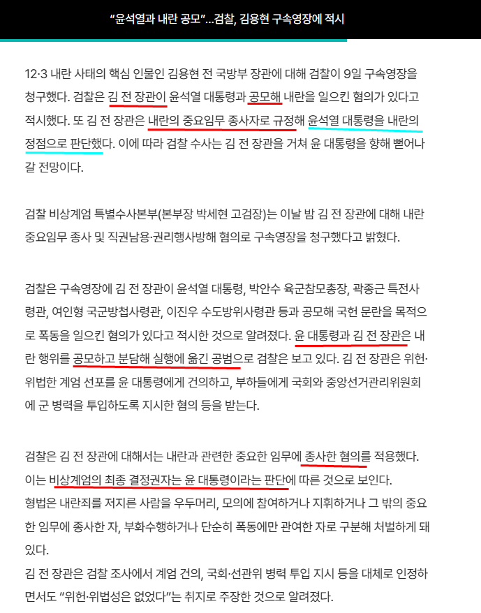 <판단 1> 그러나 검찰이 발표한 영장 내용을 보면, 윤석열과 김용현이 공모했다고 적혀져 있고, 오히려 김용현은 '내란 중요임무 종사자'이고, 이 말은 윤석열이 내란 (계엄령 선포)의 최종결정자라는 뜻이다.