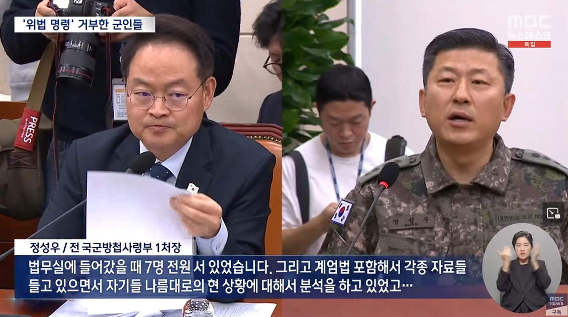 "법무실에 들어갔을 때 7명 전원 서 있었습니다. 그리고 계엄법 포함해서 각종 자료들 들고 있으면서 자기들 나름대로의 현 상황에 대해서 분석을 하고 있었고…"