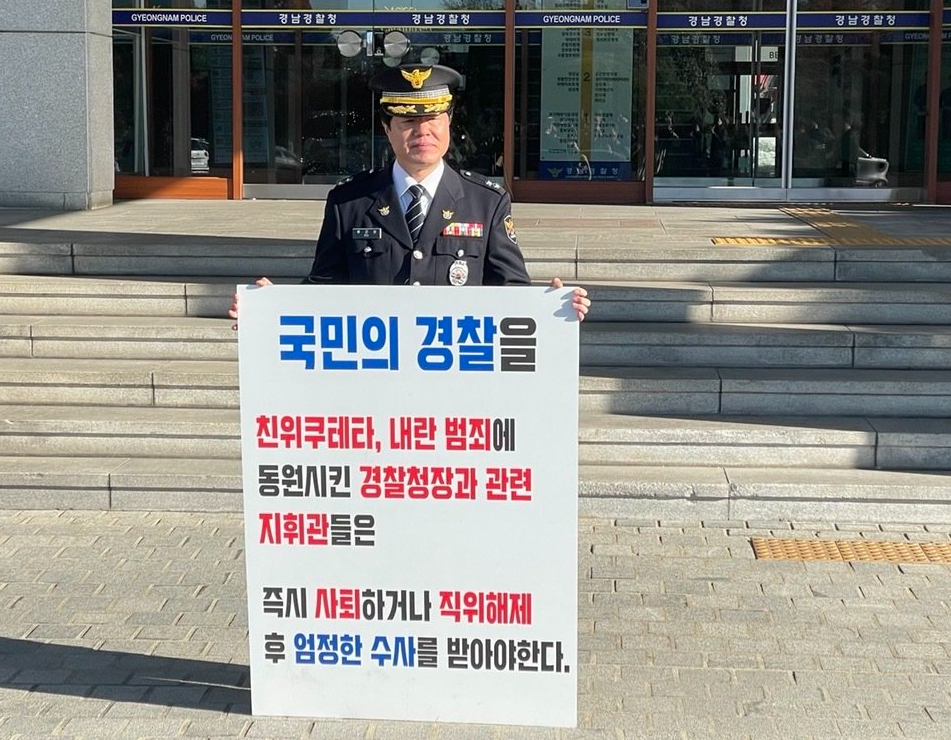 경남 마산동부경찰서 류근창 경비안보계장(경감)이 9일 경남경찰청 앞에서 조지호 경찰청장의 사퇴를 촉구하는 1인 피켓 시위를 하고 있다. 뉴스1