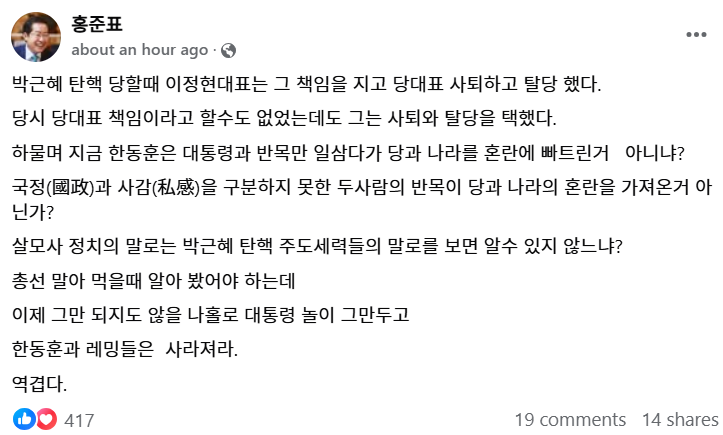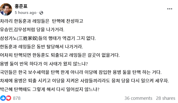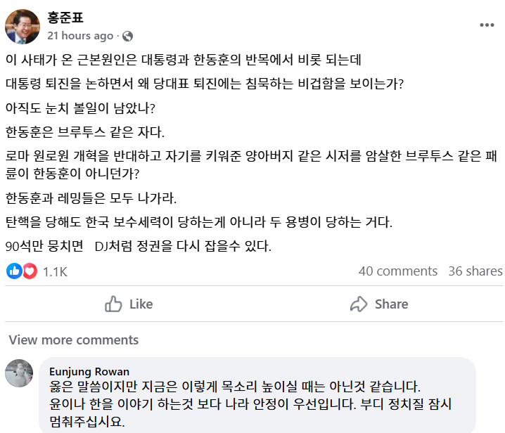 홍준표 21 hours ago · 이 사태가 온 근본원인은 대통령과 한동훈의 반목에서 비롯 되는데 대통령 퇴진을 논하면서 왜 당대표 퇴진에는 침묵하는 비겁함을 보이는가? 아직도 눈치 볼일이 남았나? 한동훈은 브루투스 같은 자다. 로마 원로원 개혁을 반대하고 자기를 키워준 양아버지 같은 시저를 암살한 브루투스 같은 패륜이 한동훈이 아니던가? 한동훈과 레밍들은 모두 나가라. 탄핵을 당해도 한국 보수세력이 당하는게 아니라 두 용병이 당하는 거다. 90석만 뭉치면 DJ처럼 정권을 다시 잡을수 있다.