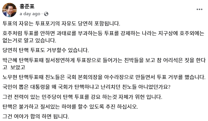 홍준표는 믿는다. 보수본당이 탄핵당한 게 아니라, 국민들은 윤석열과 한동훈을 탄핵했다고 믿는다.
