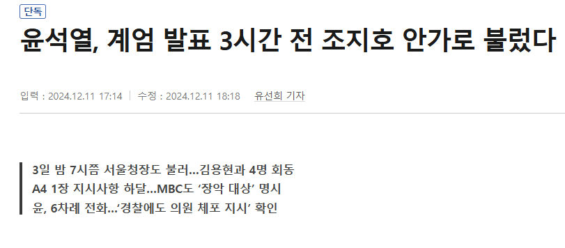 윤석열이 비화폰으로 곽종근 특수전 사령관에게만 직접 작전지시를 한 것이 아니라, 조지호 경찰청장에게도 6차례 전화로 '정치인 체포' 명령을 내렸다. (12월 3일 밤 11시 37분)