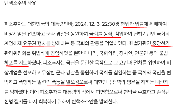 피소추자의 위헌, 위법의 비상계엄 선포와 군과 경찰을 사용한 폭동은 형법상 내란죄와 직권남용권리행사방해죄 등을 구성하며 직무집행에 있어서 헌법과 법률을 광범위하게 그리고 중대하게 위배한다.