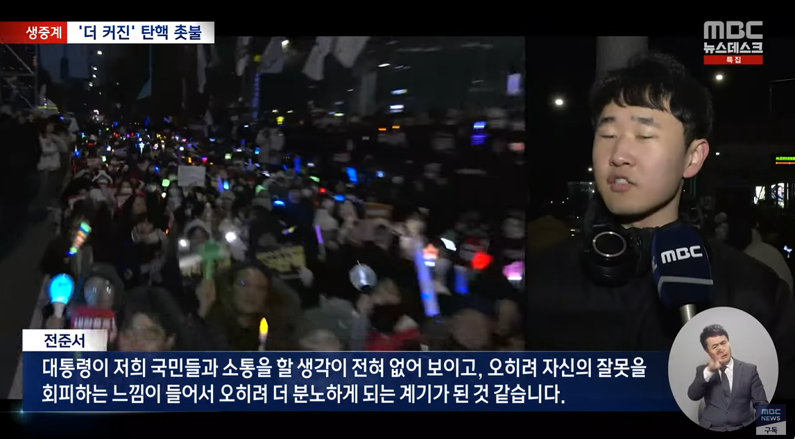 윤석열이 국민과 소통할 생각이 전혀 없고, 잘못을 인정하지 않아, 더 분노해서 탄핵시위에 나왔다.