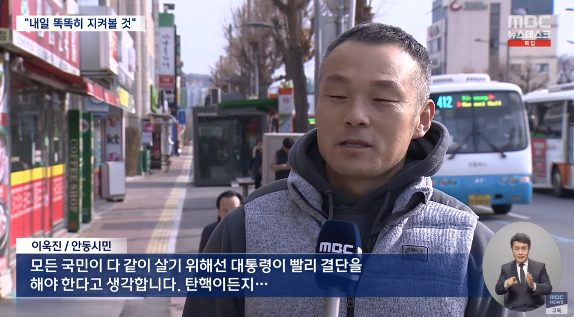 (경북 안동) 모든 국민이 다같이 살기 위해선 대통령이 빨리 결단을 해야 한다고 생각합니다. 탄핵이든지......