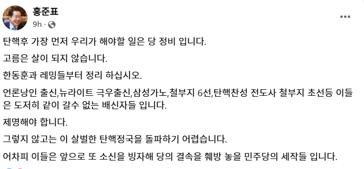 역사(history)/윤석열 2022- 윤석열 탄핵 이후,국민의힘 내부 분열. 홍준표는 당의 어른이라고 자임하면서, 반성은 없고, 한동훈과 윤석열 두 용병 탓만 by 원시 2024. 12. 15. 국민의힘 내부 분열. 홍준표는 당의 어른이라고 자임하면서, 반성은 없고, 한동훈과 윤석열 두 용병 탓만. 공유하기 게시글 관리 한국정치 노트 Notes on the Politics of Korea 저작자표시 비영리 변경금지 (새창열림) '역사(history) > 윤석열 2022-' 카테고리의 다른 글 윤석열 내란,국회폭동. 홍준표는 탄핵찬성한 김예지 의원 '징계' '탈당' 주장, 진지 이탈자는 '참수'해야 한다는 막말까지. 국민의힘이 전혀 반성을 하지 않는다. (1) 2024.12.18 윤석열의 '국회 폭동'은 형법 87조 내란죄 - 대한민국 영토의 전부 또는 일부에서 국가권력을 배제하거나 국헌을 문란하게 할 목적으로 폭동을 일으킨 자. 91조 국헌문란 뜻. (3) 2024.12.17 윤석열 내란 공모자. 이진우의 거짓말 (수도방위 사령관) (5) 2024.12.16 역대 최다.2.5년간 (윤석열 대통령 거부권 행사. 11차례, 24건) 이제는 조선시대 왕같은 '대통령제'를 폐지할 때가 되었다. 역대 대통령 거부권. 1988년 이후, 16차례 (5) 2024.12.15 내란죄의 경우 대통령 불소추특권이 없어져, 윤석열은 헌법재판소 재판 이전에 구속될 수 있다. (47) 2024.12.15 광주 고등학생들 7천명 시국선언. 윤석열의 계엄령은 1980년 518 광주의 아픔을 떠올렸다. (4) 2024.12.14 윤석열 탄핵가결 이후, 윤석열 입장 발표 전문, 윤석열 '탄핵'에 대한 반성과 사과는 전혀 없고, 2.5년 윤석열 정부 정책 성과 발표. (5) 2024.12.14 관련글 윤석열의 '국회 폭동'은 형법 87조 내란죄 - 대한민국 영토의 전부 또는 일부에서 국가권력을 배제하거나 국헌을 문란하게 할 목적으로 폭동을 일으킨 자. 91조 국헌문란 뜻. 윤석열 내란 공모자. 이진우의 거짓말 (수도방위 사령관) 역대 최다.2.5년간 (윤석열 대통령 거부권 행사. 11차례, 24건) 이제는 조선시대 왕같은 '대통령제'를 폐지할 때가 되었다. 역대 대통령 거부권. 1988년 이후, 16차례 내란죄의 경우 대통령 불소추특권이 없어져, 윤석열은 헌법재판소 재판 이전에 구속될 수 있다.