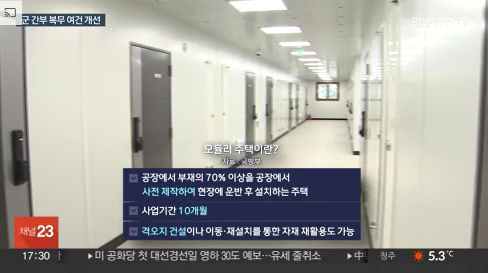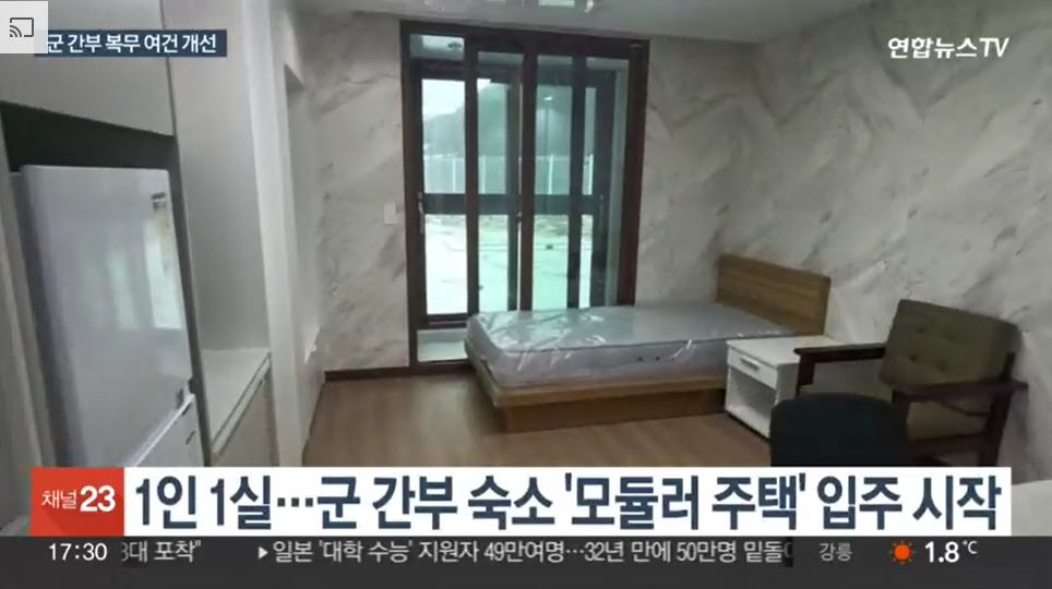 [앵커] 여태껏 군 간부 숙소 공급물량이 모자라 2명이 방 하나를 같이 사용했던 실정이었는데요. LH 행복주택 임차와 모듈러 숙소 공급으로 내후...