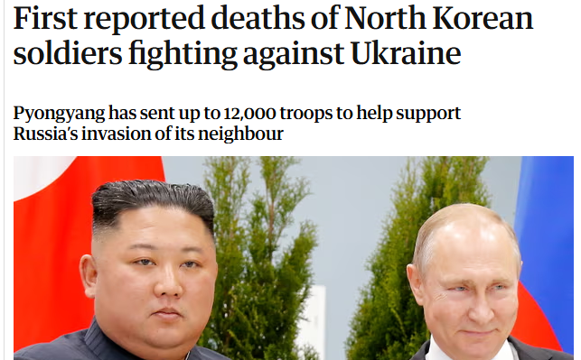 미 국방부(펜타곤)과 우크라이나 정보국 발표: 첫 북한군 사상자 발생. 러시아 원조 중인 북한군 러시아 영토 크루스크에서 30여명 사상자 발생.