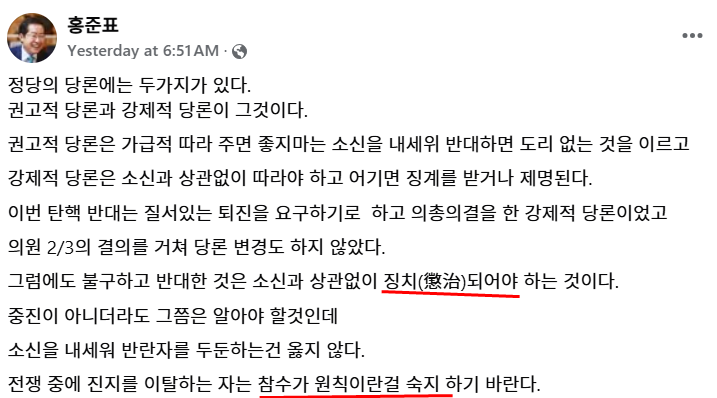 홍준표는 사람들이 거의 쓰지도 않는 '징치' 라는 단어를 써가면서, 윤석열 탄핵에 찬성한 국민의힘 의원들을 비난.