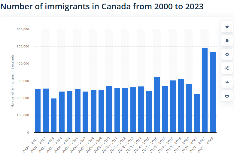 캐나다는 2000년대까지는 매년 20~25만명을 이민자로 받아들였다. 그러다가 지난 몇 년간은 40만을 넘기도 했다.