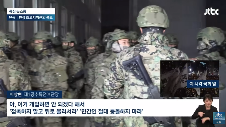 [이상현/제1공수특전여단장 : 아, 이거 개입하면 안 되겠다 해서 '접촉하지 말고 뒤로 물러서라' '민간인 절대 충돌하지 마라' '다치게 하면 안 된다' '총기를 뒤로 메라'(고 지시해…)]
