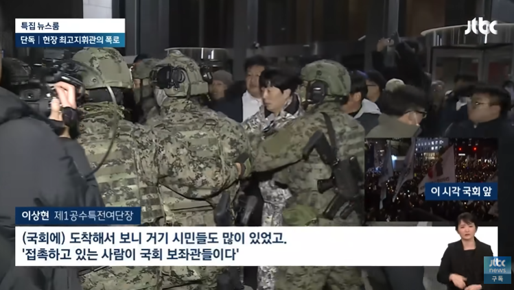 [이상현/제1공수특전여단장 : (국회에) 도착해서 보니 거기 시민들도 많이 있었고. '접촉하고 있는 사람이 국회 보좌관들이다', '국회 보좌관들과 대치 중이다' 이런 보고를 받았습니다.]